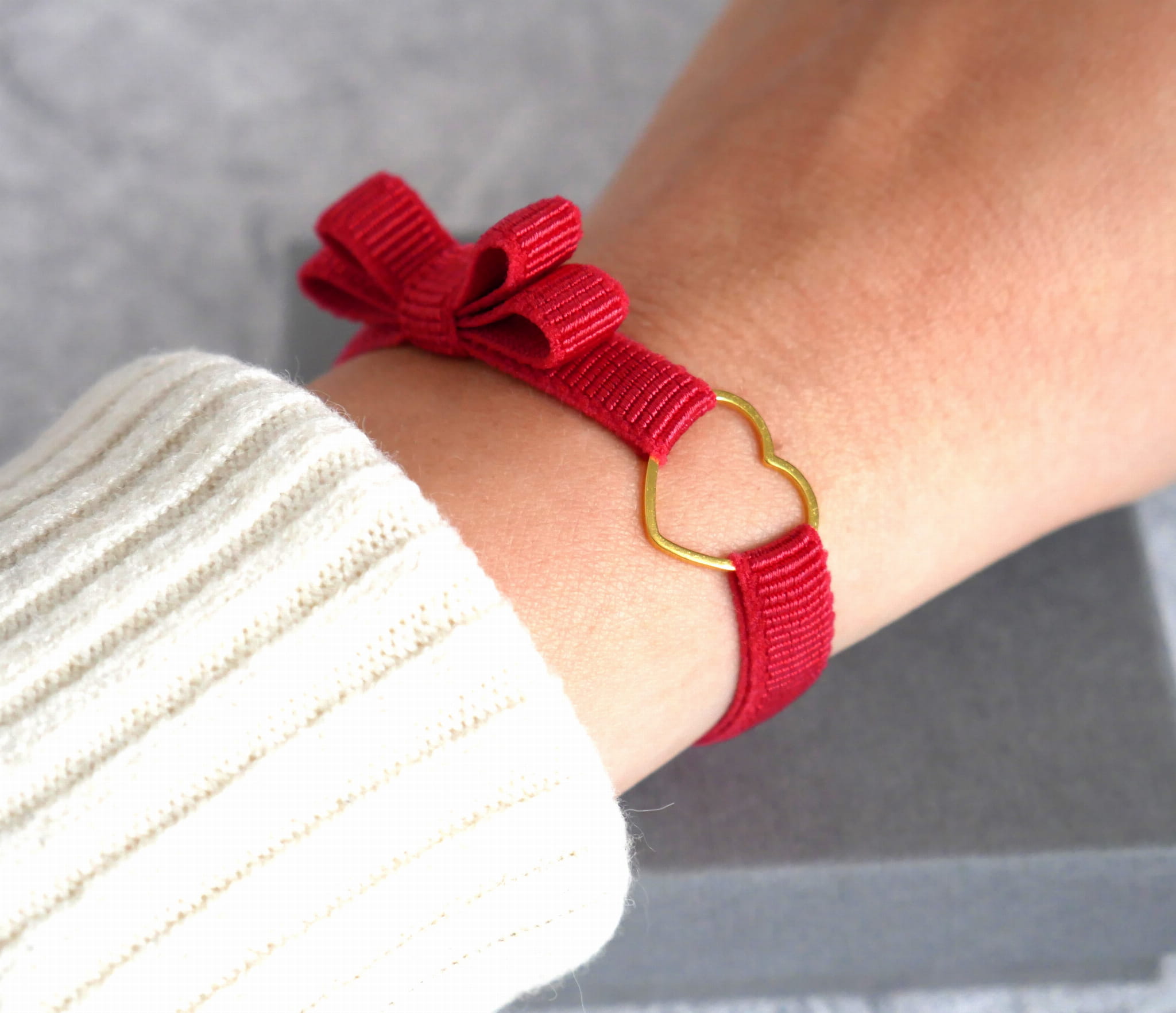 Czerwona bransoletka z sercem z kokardką - Pomysł na prezent - dowolny kolor - Bransoletka na elastycznej wstążce z kokardką
