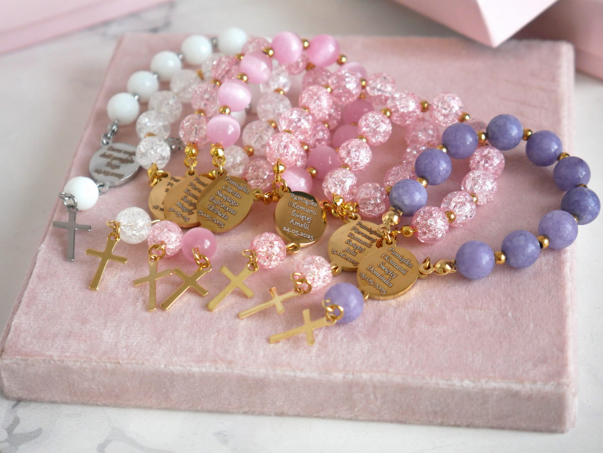 Pamiątka Chrztu Świętego dla dziewczynki lub chłopca - Kamień z grawerem - imie + data - Różaniec personalizowany dziecięcy